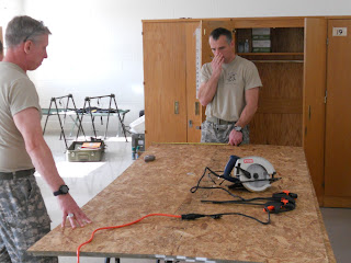 So here is the sart of our clinic that we are setting up. Its still not quite done, but it keeps getting closer and closer. When we first found this room it was a big empty room with a single magazine rack. So after pillaging thru the barracks we found some extra stand alone closets. But the thing was they didn't have enough shelve space. So what do the 2 Special Forces doctors do. They go to home depot and build their own!